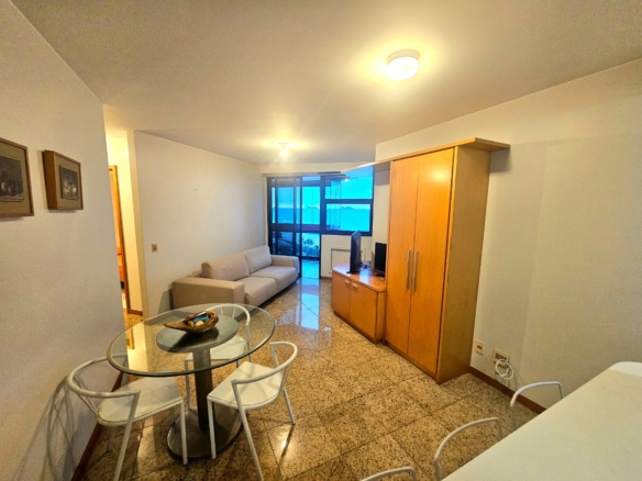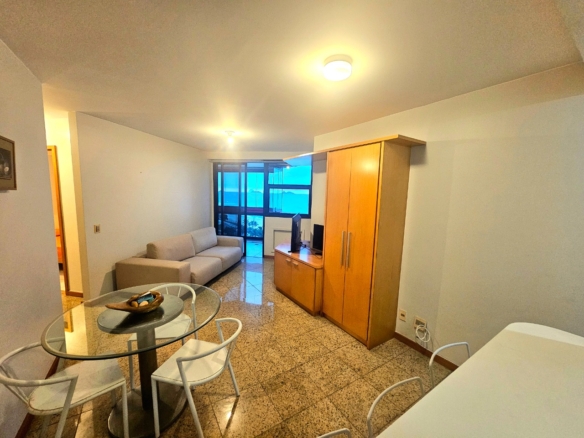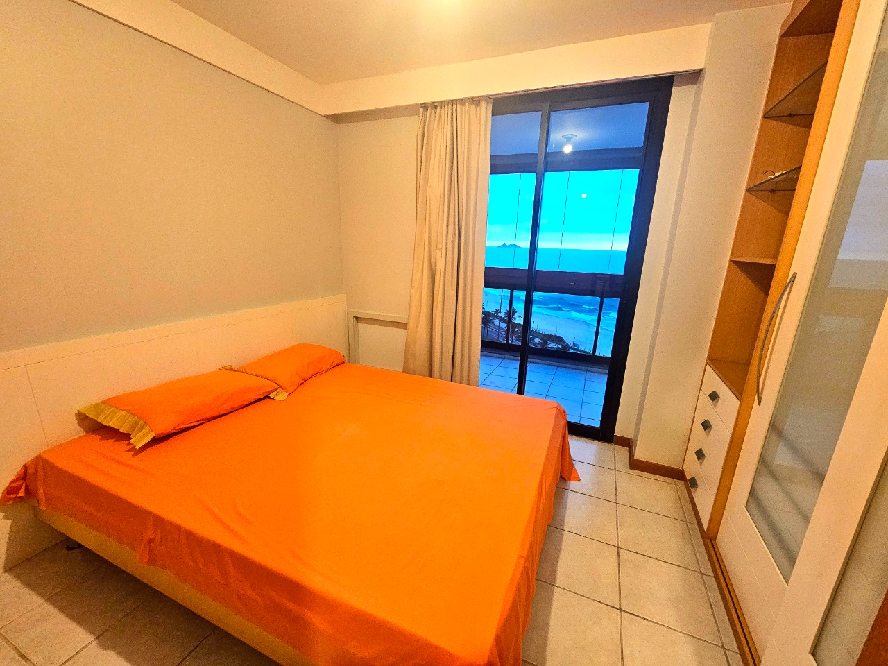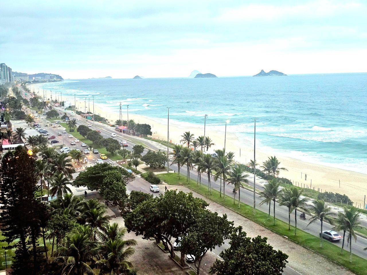 Apartamento com sala de jantar e estar, varanda ampla e uma vista maravilhosa da praia da Barra da Tijuca, onde o mar se estende até o horizonte. Vista espetacular.