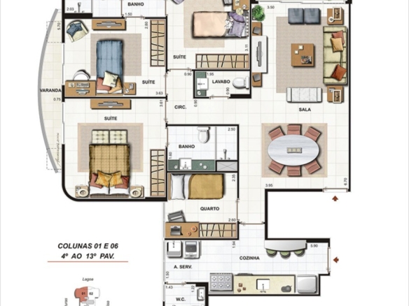 Sala ampla com potencial de integrar com a varanda. Suítes com varanda e armários