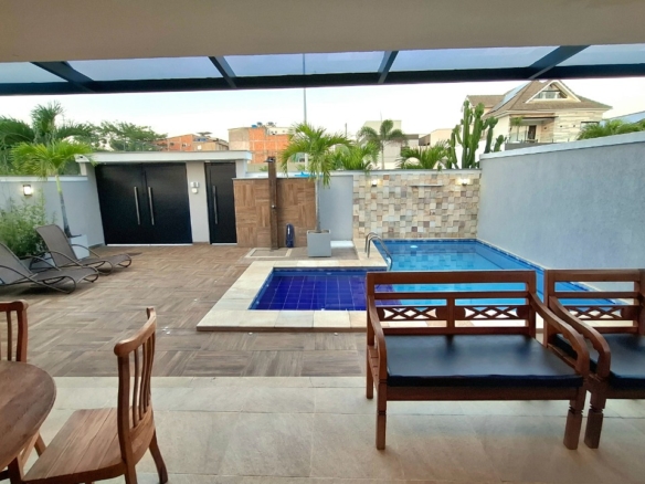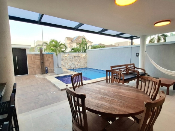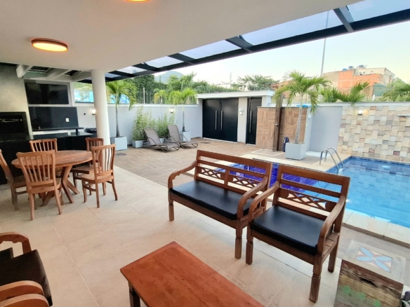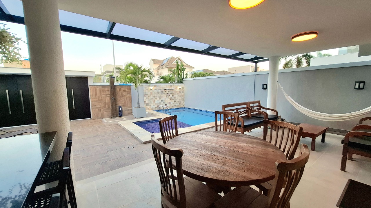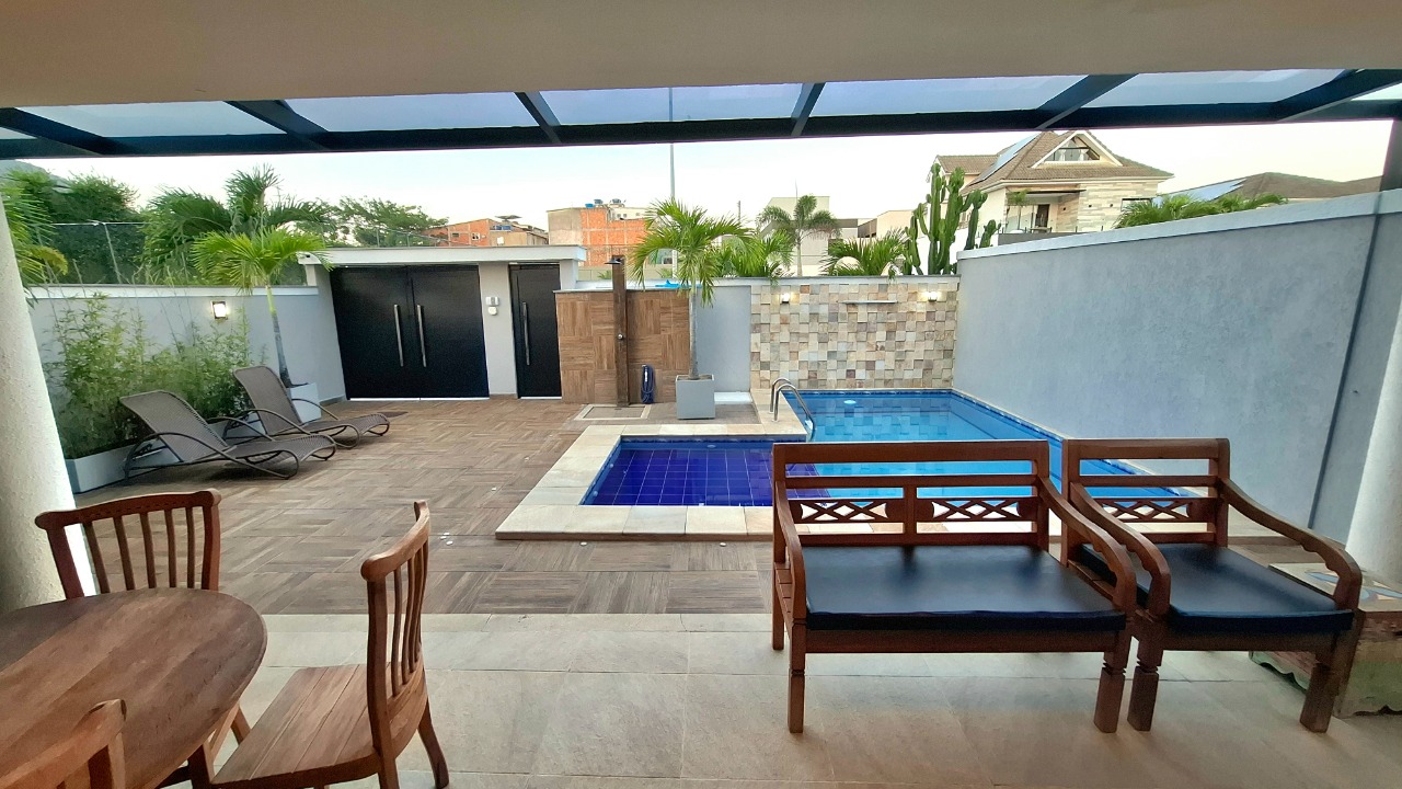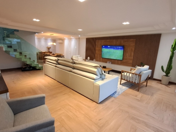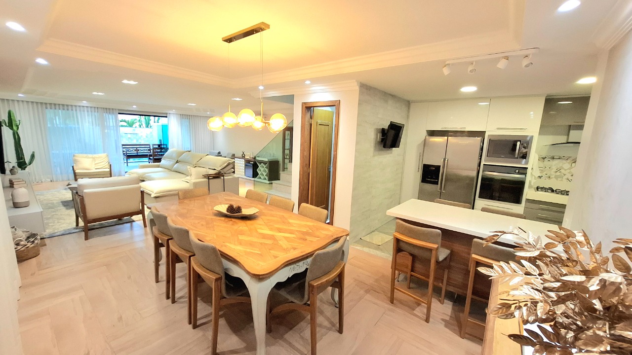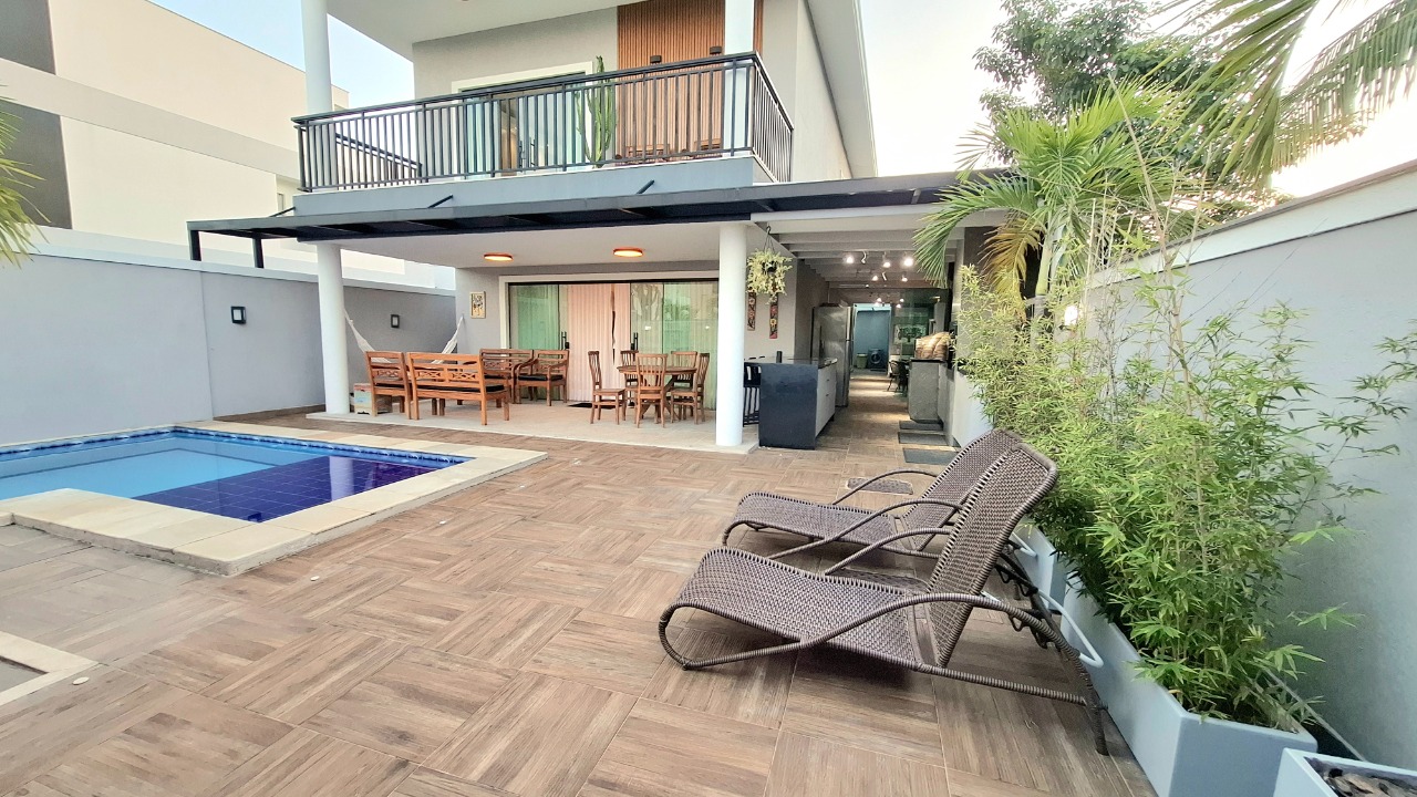 Casa com piscina, três pavimentos, área gourmet com churrasqueira, forno de pizza e ilha com fogão de indução.